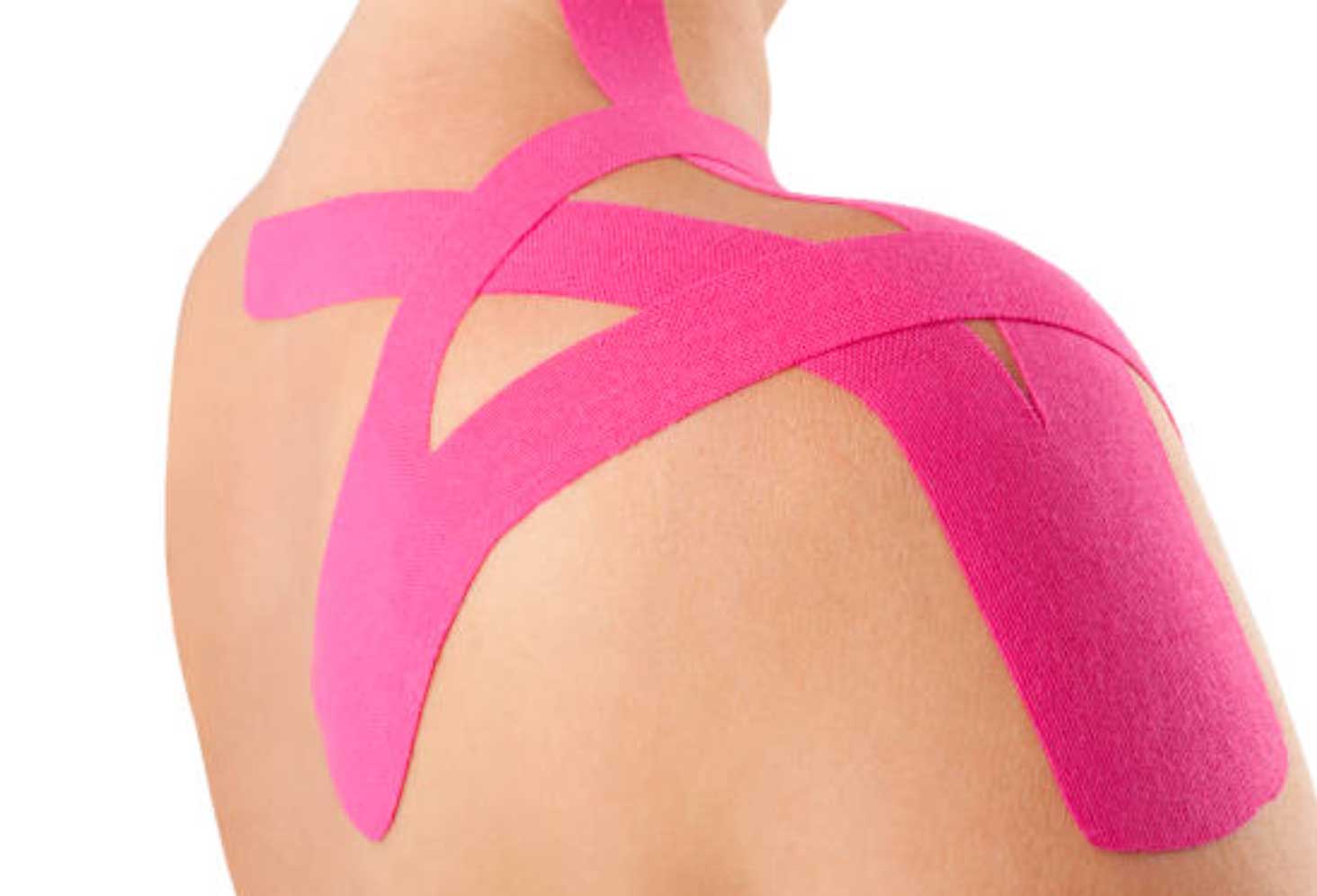 Those bright coloured tapes you saw our athletes wearing to support their muscle were probably Kinesio tape. But it isn’t anything new, it was invented by a Japanese chiropractor Dr Kenzo Kase in the 1970s. It comes in bright blue, pink, beige and black and you don’t have to be an athlete to use it. Injuries sustained by repetitive strains respond very well to Kinesio tape. It is also used to help aid healing in scar tissue and to reduce bruising and improve lymphatic drainage. Please call us to enquire about a consultation just for Kinesio tape. See below image of a shoulder taped up suitable for a sporting injury or just to improve poor posture.
